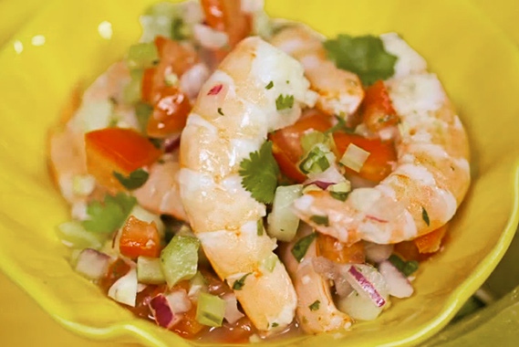 Place the poached shrimp into a glass bowl and add the remaining ingredients. Stir well and cover with an airtight lid or plastic wrap when finished. Refrigerate overnight. While the mixture marinates, occasionally turn the container to move the shrimp in the marinade.