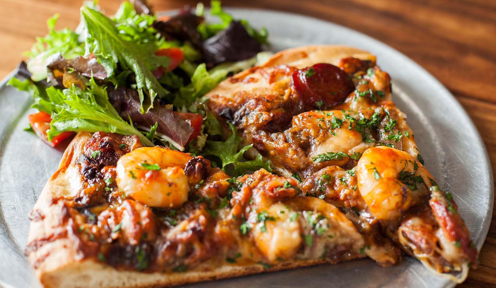 As you can imagine, the Gumbo Pizza is full of flavor. The mild flavor of the chicken and shrimp serve to balance out the spice of the sausage, and the roux is a perfect substitute for tomato sauce. Simply put, it’s gumbo on a pizza—and it’s fantastic.