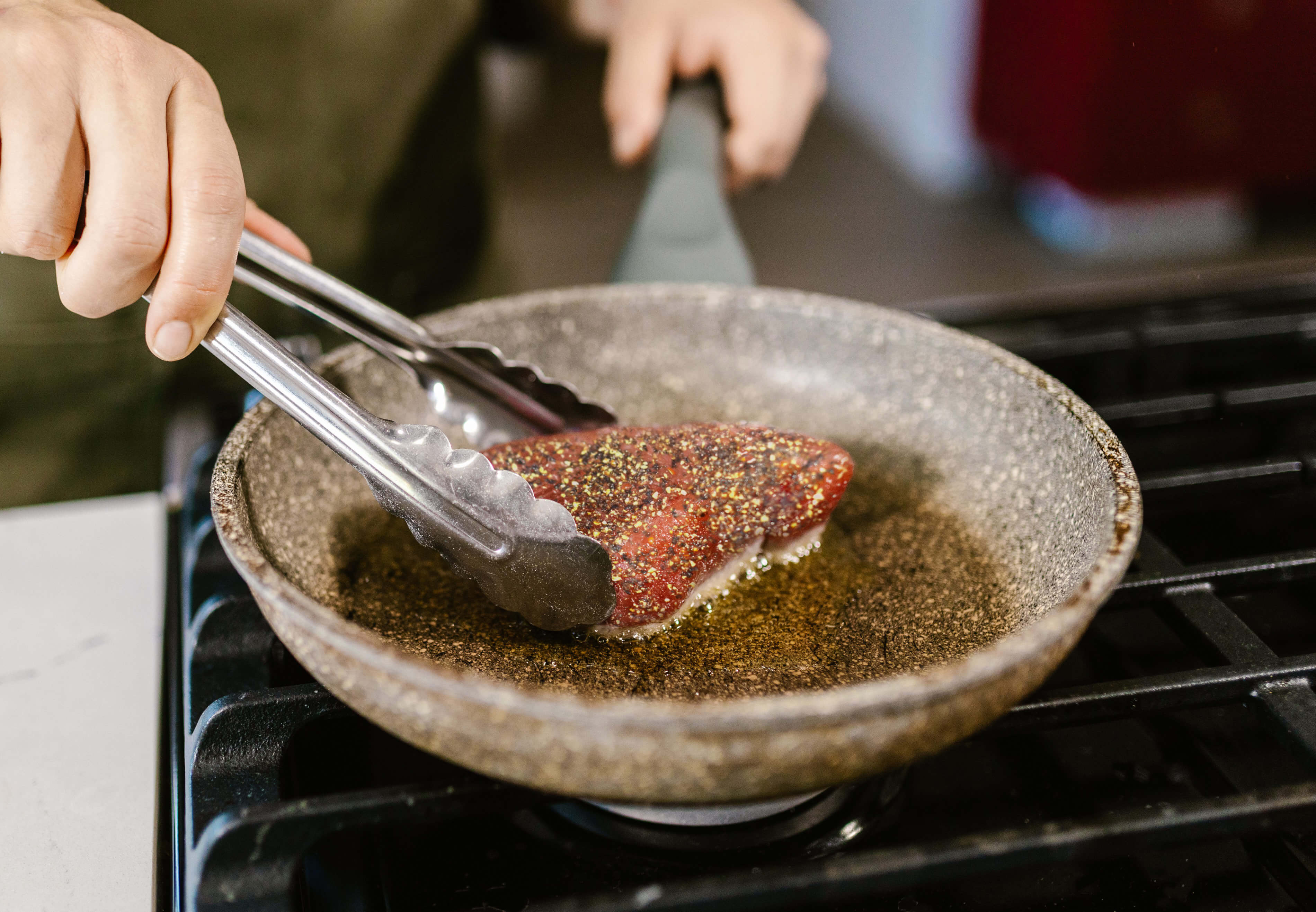 Melt the butter in the oil in a sauté pan over high heat. Add the tuna steaks. Cook for 3 minutes on each side for rare or until the steaks flake easily. Move the steaks to a warm platter.