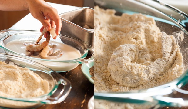 Find a separate bowl for the buttermilk and pour it in. One-by-one, take your shrimp and dip them in the buttermilk until they’re covered, letting the excess buttermilk drip off. (Make sure you’ve left the tails on the shrimp; this makes them easier to pick up when it comes time to eat.) Once the shrimp are soaked in buttermilk, toss them into the dry mix until they’re gently coated, removing any extra breading to make sure it’s a light coat. This process is often called “dredging.”