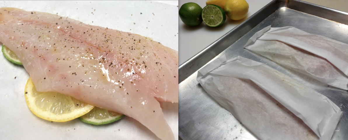 In a bowl, whisk together olive oil, salt, pepper and 1 teaspoon each lemon and lime, juices and drizzle over fish. Top each piece of fish with a few very thin slices of lemon or lime. Tightly fold the parchment paper into packages and make sure they are sealed well. Put packages on a baking sheet and bake for 8-10 minutes, depending on the size and thickness of the fish.