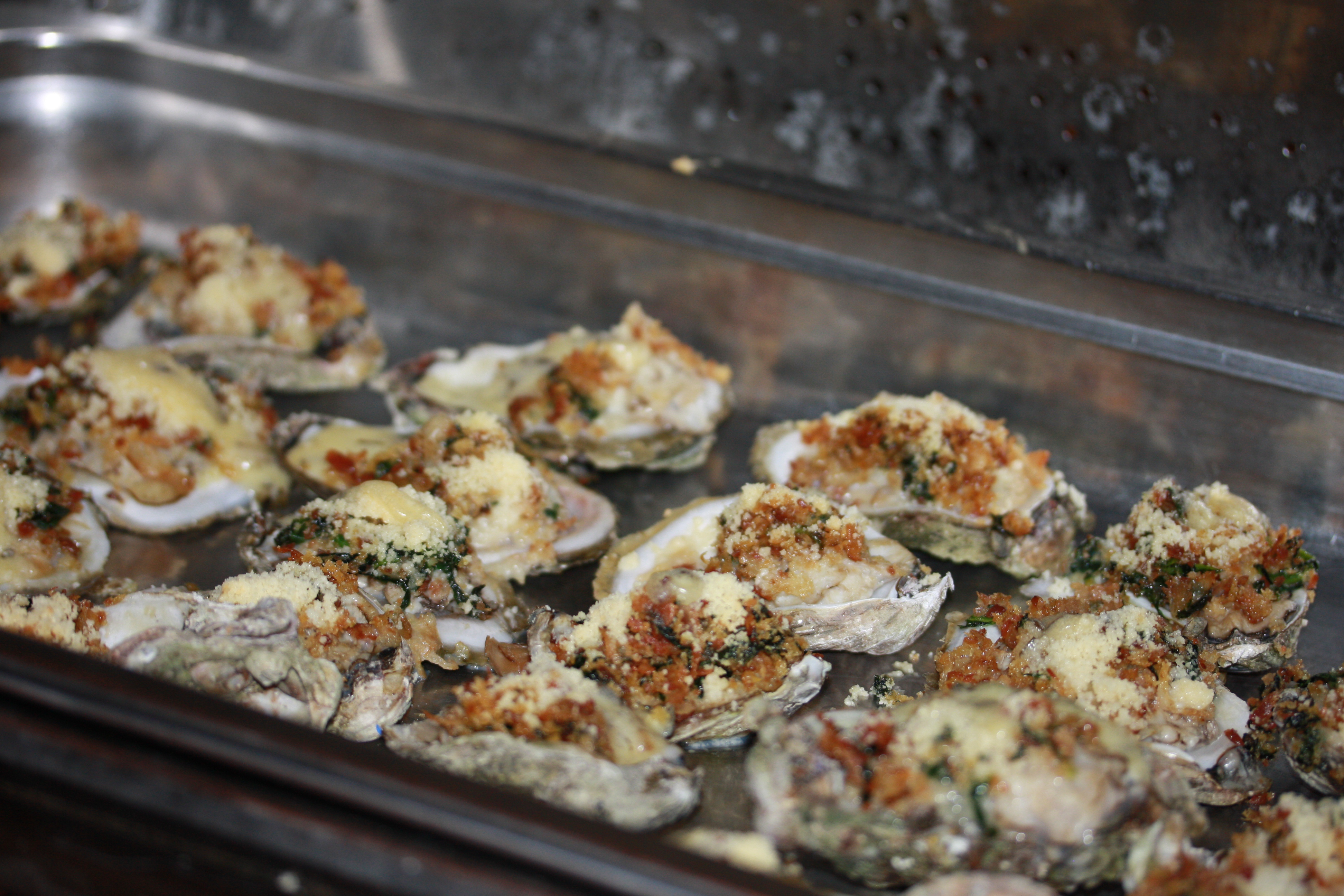 When all of your oysters are properly decorated, bake them for 5 minutes at 425 degrees, or until the bread crumbs are golden and the cheese is bubbly.