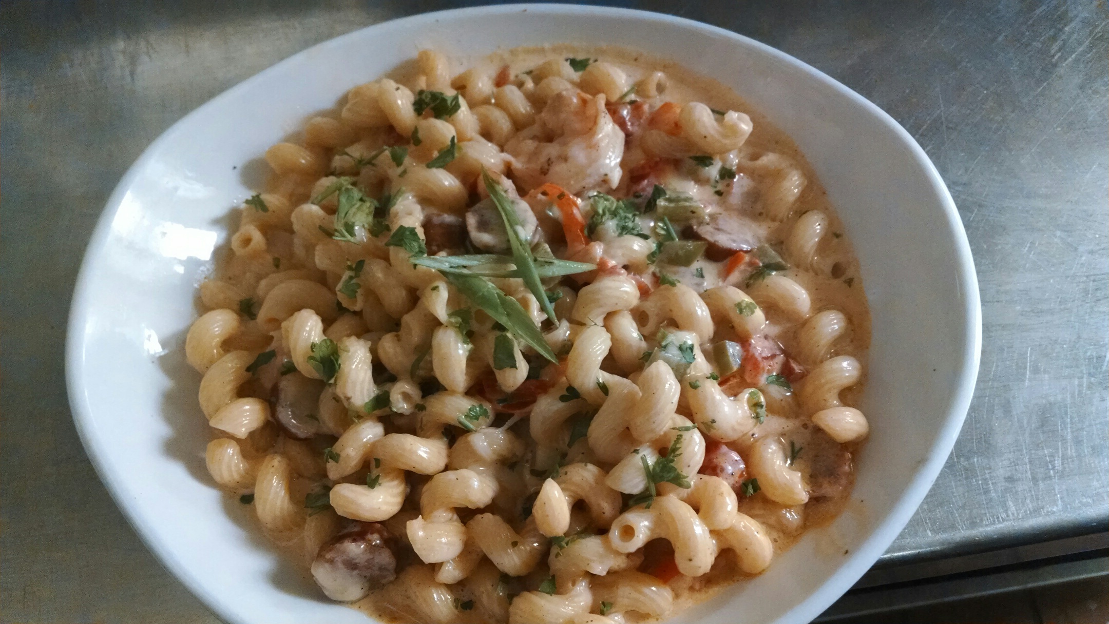 Heat oil in saute pan. While oil is heating, coat shrimp with blackening seasoning. Add onion, peppers, tomatoes, and sausage and use about 1/3 of the creole seasoning.