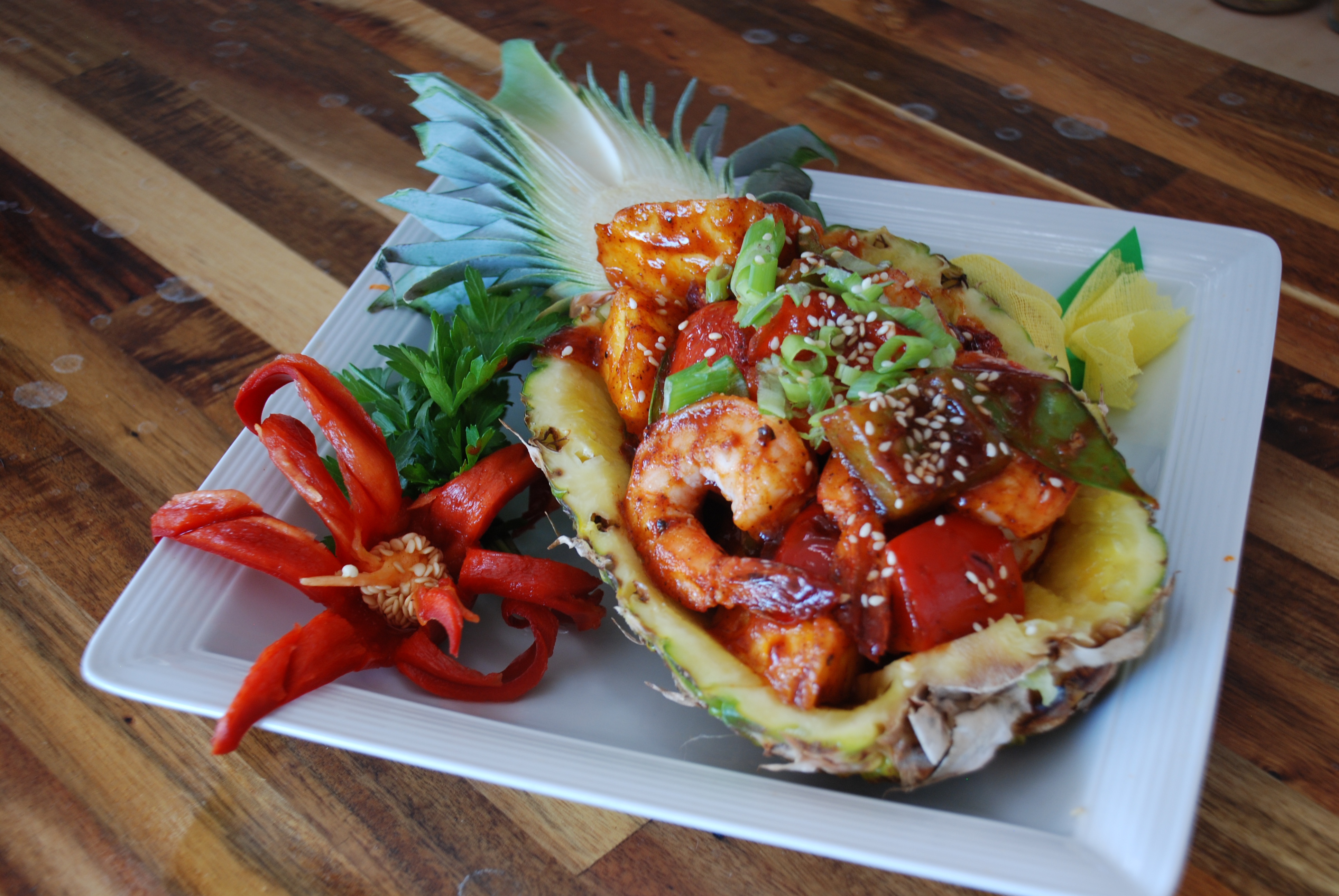 Add remaining 1 tablespoon of oil to skillet. Add shrimp and cook 2 to 3 minutes or until shrimp turns pink. Stir in reserved sauce, pineapple chunks, and vegetables, heat until hot. Serve in pineapple shells and top with green onions and sesame seeds. Serve with hot steamed brown rice.